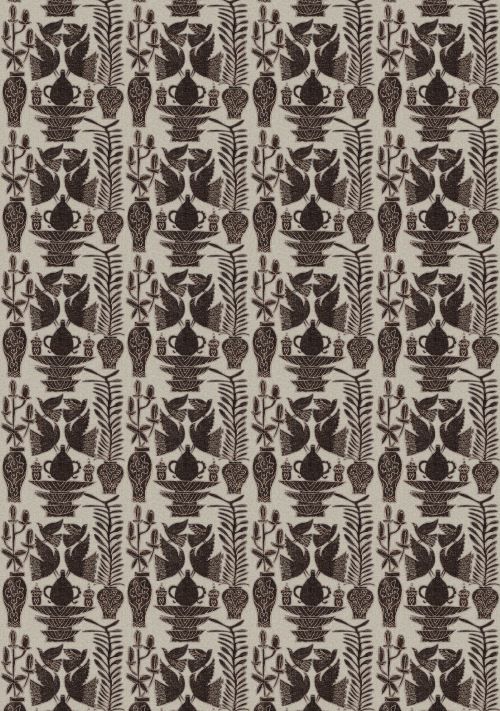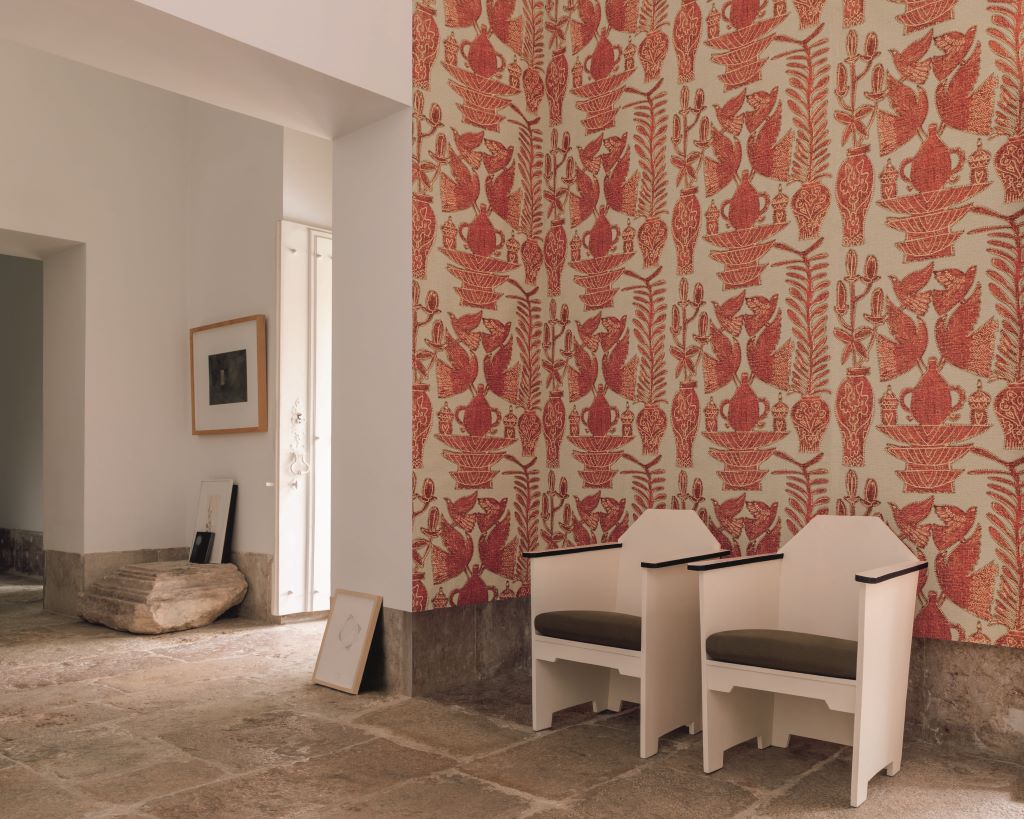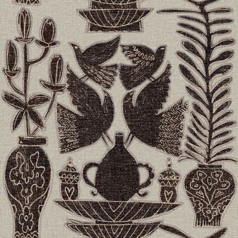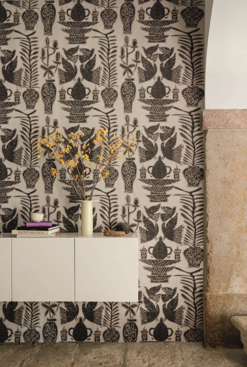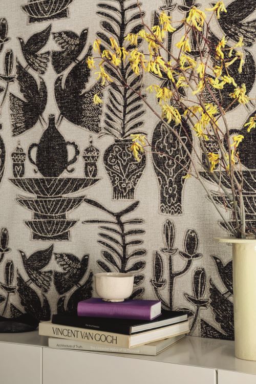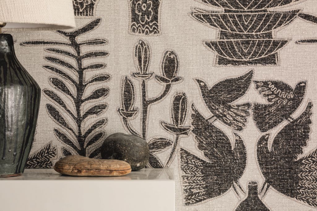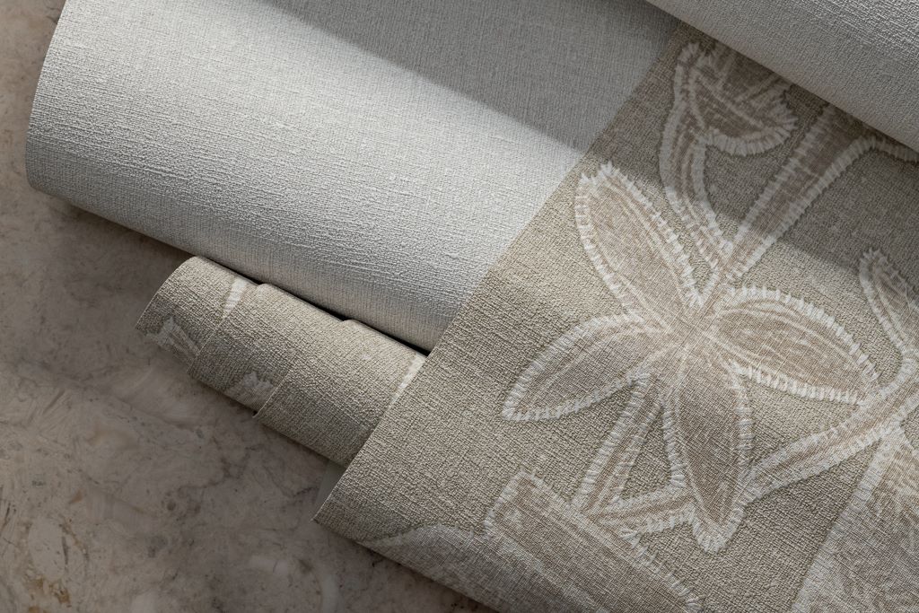 Vinyle gaufré à l’aspect de broderie sur lin.